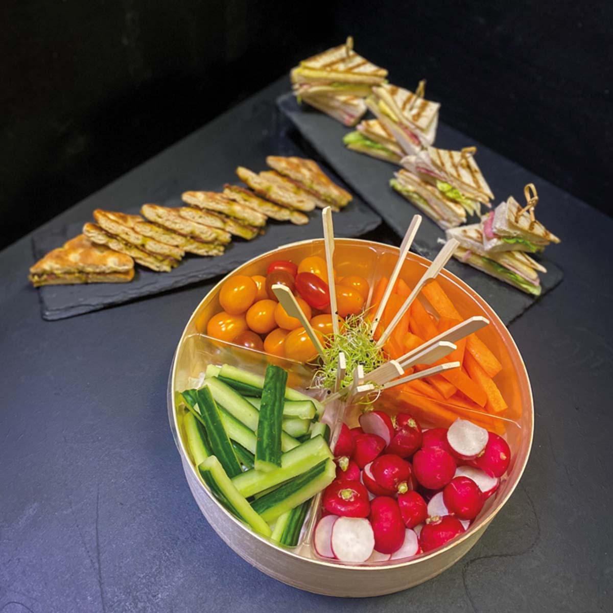 Crudités : Radis rouge, carottes, tomates cerises, concombre sauce crudités fines herbes