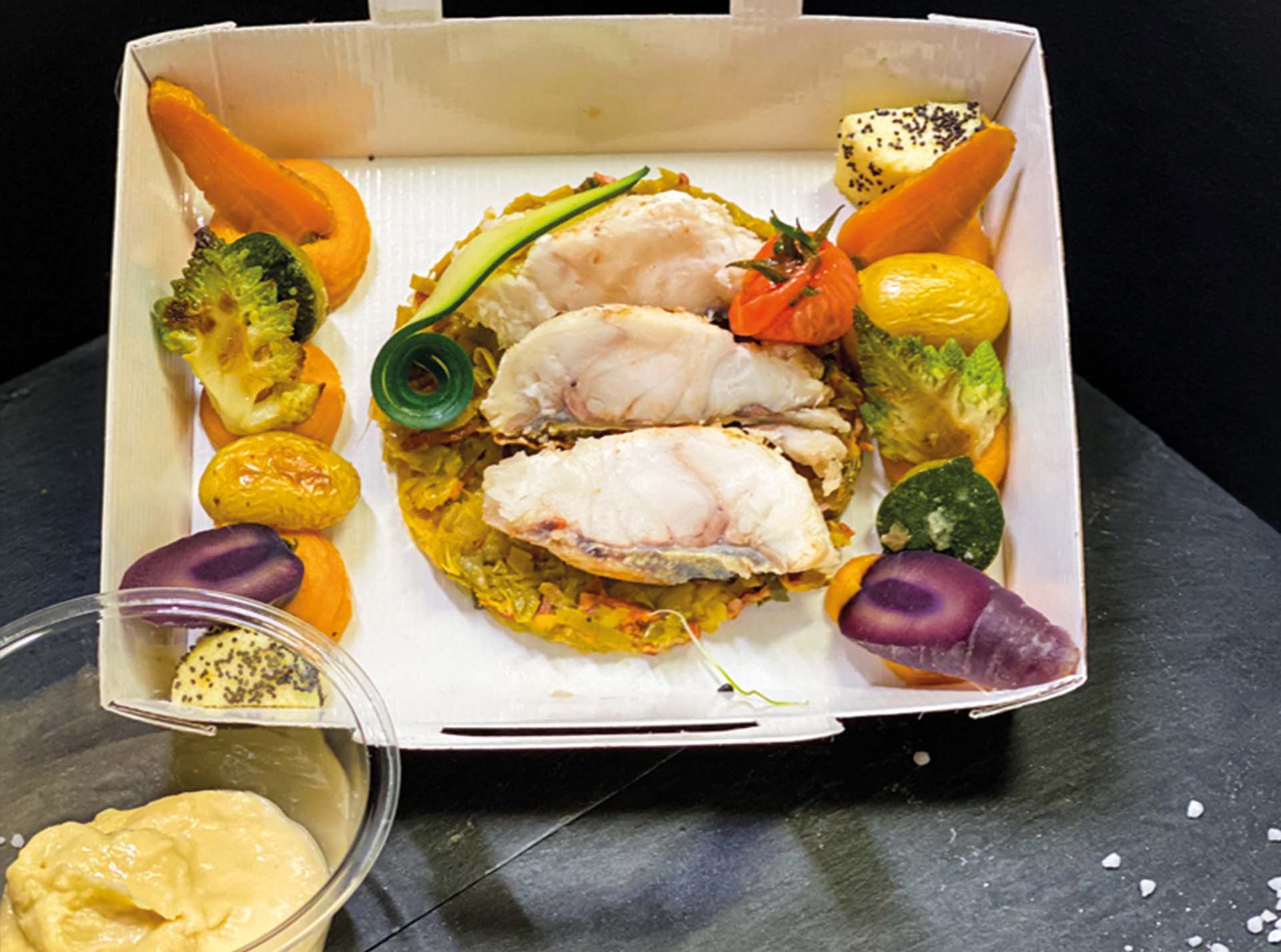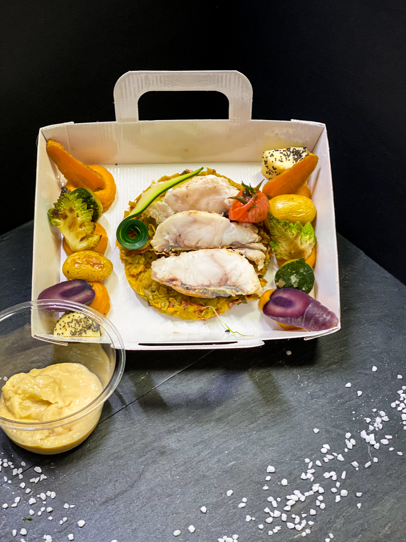 accompagné d’une sauce beurre blanc citronnée, perles de citron yuzu et poireaux à la vanille Bourbon
